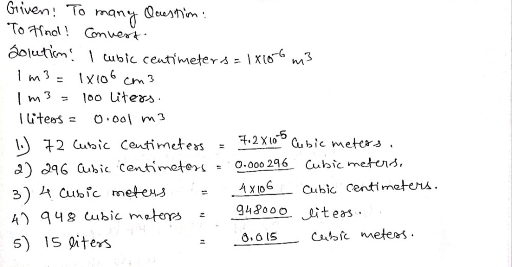 First you need to know the relationship between meters and centimeters which is; how to change cm to m. Convert 9 cubic meters to cubic centimeters (show work) formula: